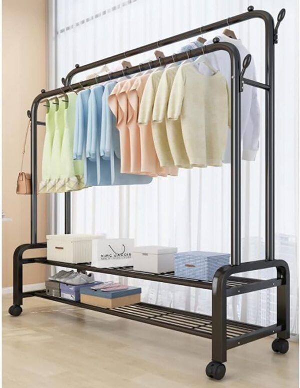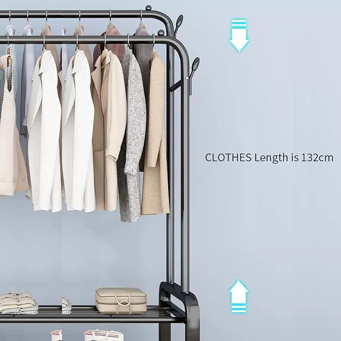 Multifuncional, el carrito de abrigos se adapta a cualquier lugar y su largo riel de ropa puede contener sus camisas, pantalones, abrigos y otras prendas largas. La capa inferior de los estantes es adecuada para guardar zapatos, cajas de almacenamiento y otros artículos. Hay 4 ganchos en el lateral para guardar bolsas, sombreros, etc.